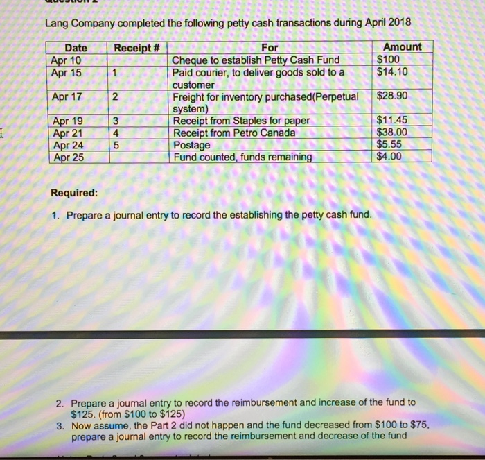 Solved Lang Company Completed The Following Petty Cash Chegg Com